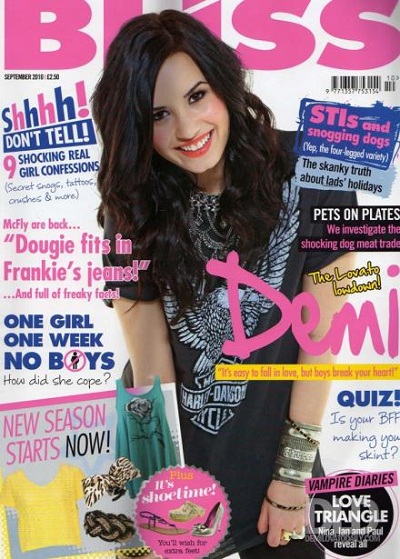 Mas para além do sorriso perfeito de Demi da Califórnia, cachos e pele brilhantes, ela é como qualquer garota adolescente normal. Ela está apaixonada, teve seu momento de coração quebrado, foi tratada com golpes baixos das meninas na escola, e às vezes diz coisas que ela se arrepende (pense, “Por que você não pergunta a Taylor?” em resposta a uma fã perguntando sobre a antiga BFF Selena Gomez). Livre de sua separação de Joe Jonas, Demi não está com medo de derramar-se. Depois que o ensaio terminou e o estoque de petisco de Demi da mesa da abundância, ela se transforma em uma simples calça preta e top preto, abraça as pernas até seu peito enquanto ela se senta no sofá azul-escuro, e começa a abrir seu coração para a BLISS na mais reveladora entrevista que ela já deu…